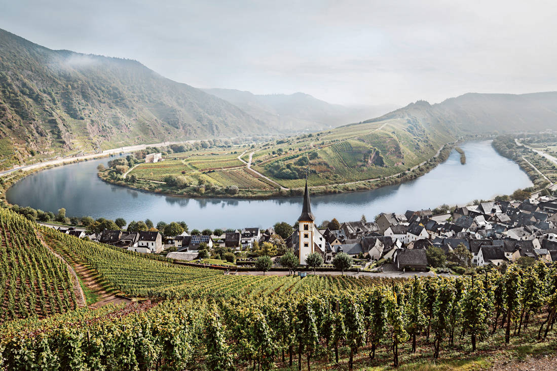 Das Moseltal ist keine Berglandschaft im klassischen Sinne, aber nicht weniger dramatisch. Der Fluss schlängelt sich wie eine zusammengerollte Schlange zwischen steilen, mit Weinbergen bedeckten Hängen hindurch. Hier schlägt das Herz des deutschen Weinbaus, die Heimat des berühmten Rieslings, und hinter jeder Kurve eröffnet sich ein neues Panorama.