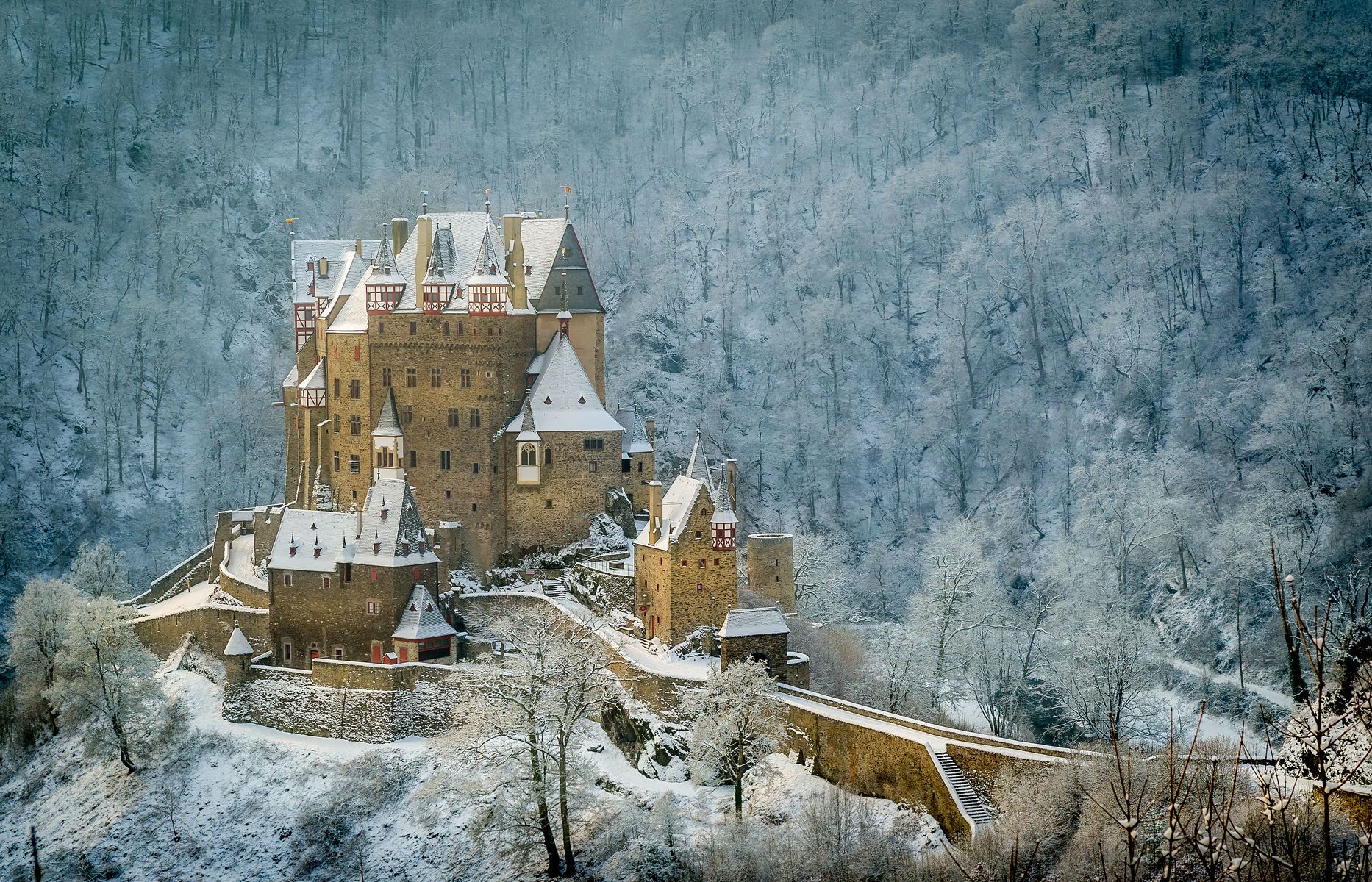 Versteckt in einem dichten Wald am Ufer der Mosel liegt Schloss Eltz, eine der wenigen mittelalterlichen Burgen Deutschlands, die nie im Krieg zerstört wurden. Seit dem 11. Jahrhundert befindet sie sich im Besitz derselben Familie und wird noch heute von ihr bewirtschaftet. Sie ist kein Museum, sondern ein lebendiger Organismus, in dem die Vergangenheit in jedem Stein atmet.
