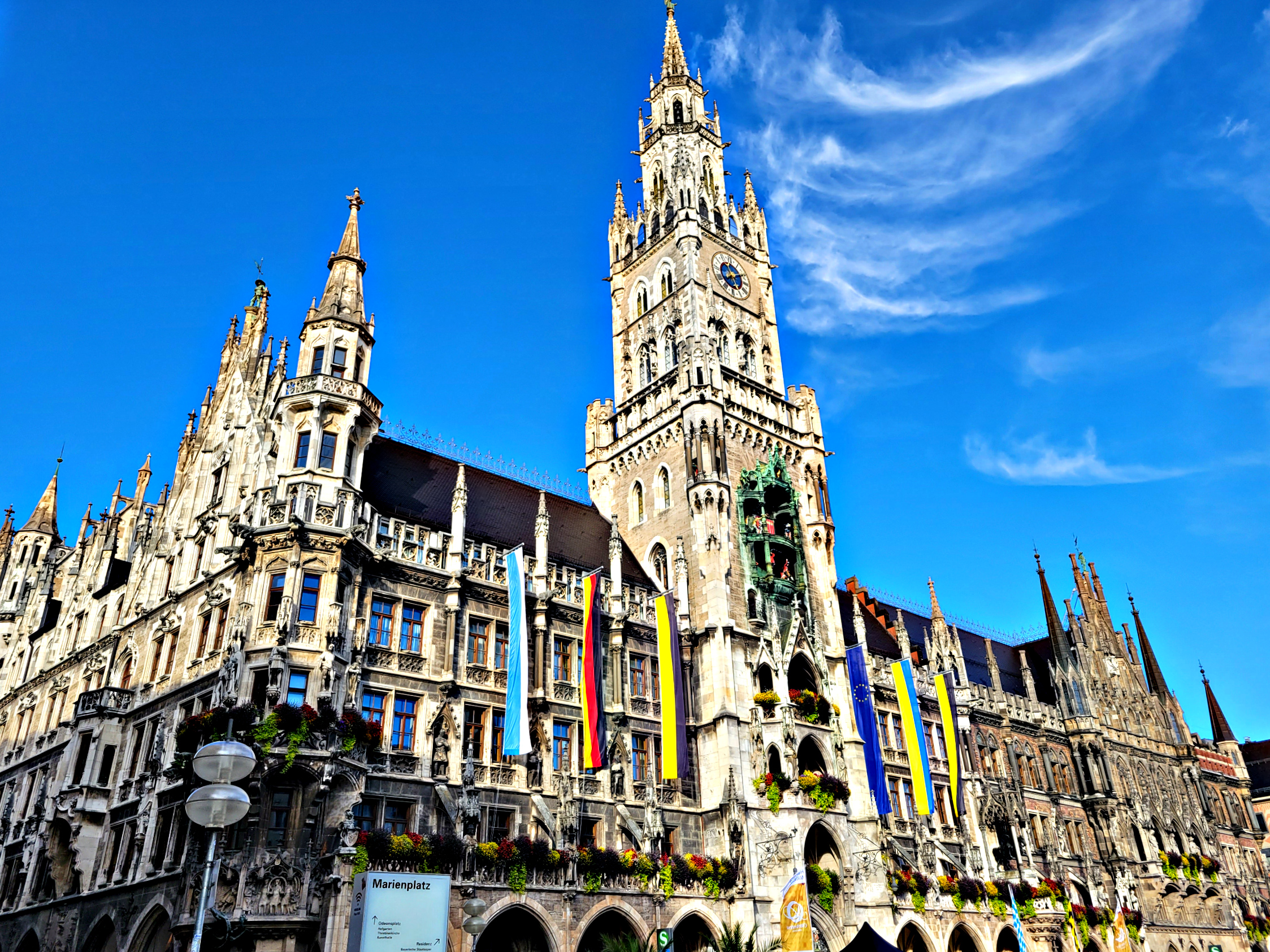 Das Zentrum Münchens ist der Marienplatz, der Platz, an dem seit 1315 das Neue Rathaus mit seinem berühmten Glockenspiel steht. Täglich um 11:00 Uhr (und im Sommer um 12:00 Uhr) beginnt eine faszinierende Show: Ritter tanzen, ein Hahn kräht, und Heinrich der Löwe zu Pferd begrüßt die Besucher. Dies ist keine Touristenfalle, sondern Teil des Münchner Alltags.